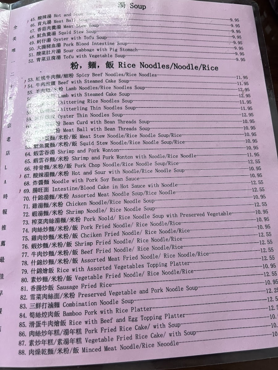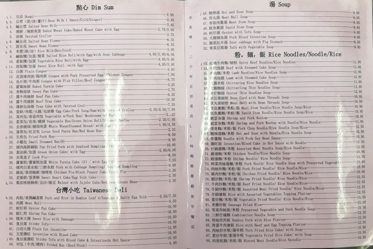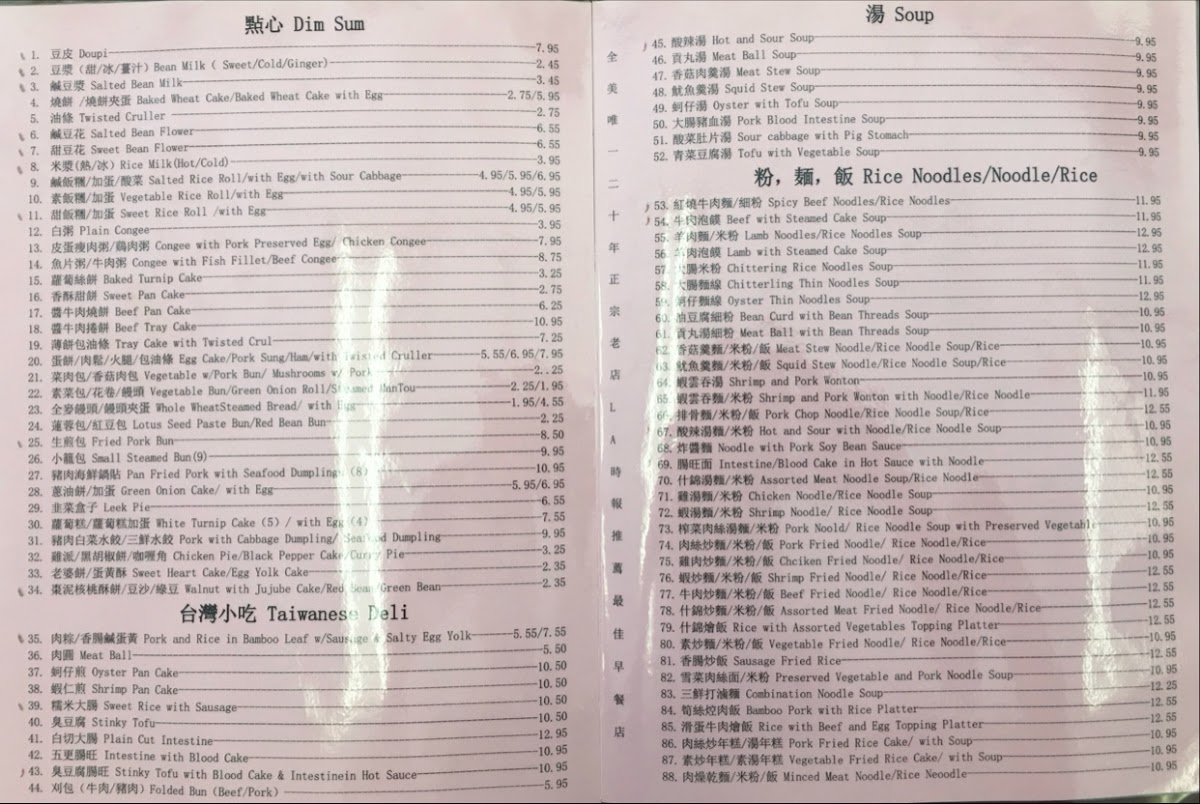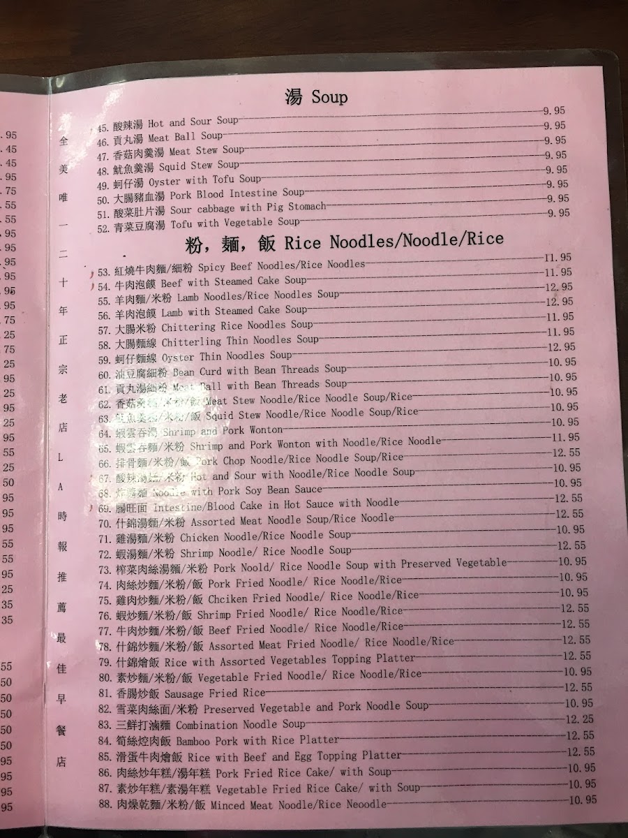 Yung Ho Dou Jiang Restaurant offers a diverse and flavorful menu, perfect for those craving authentic Chinese comfort food. Their dim sum selection includes Salted Rice Roll, Vegetarian Salted Bean Milk, and the classic Pork with Cabbage Dumpling (takes 15 mins), alongside unique options like Stinky Tofu and Leek Pie. For buns, you can enjoy Steam Bun, Vege Meat Bun, and the hearty Whole Wheat Steam Bun. Their soup options are warming and flavorful, with choices like Hot and Sour Soup, Meat Ball Soup, and the more adventurous Pork Blood Intestine Soup. The rice noodles and noodles section offers satisfying dishes like Spicy Beef Noodles and Minced Meat Noodle, as well as Lamb Noodles Soup and Shrimp and Pork Wonton. If you're looking for something lighter, their side dishes like Thousand Year Egg with Bean Curd and Salty Duck Egg are perfect accompaniments. For beverages, they offer refreshing options like Sweet Tea, Sprite, and Chinese Herbal Tea. The main dishes are hearty, with options like Beef with Mushroom and Celery and Pork with Dry Bean Curd, while the Cookies section features treats like Walnut with Red Date and Sweet Heart Cake. Lastly, their congee offerings such as Beef Congee and Congee with Fish Fillet are ideal for a comforting, satisfying meal. Overall, Yung Ho Dou Jiang's menu combines a wide range of traditional and innovative dishes, making it a must-visit spot for anyone looking to explore authentic Chinese flavors.