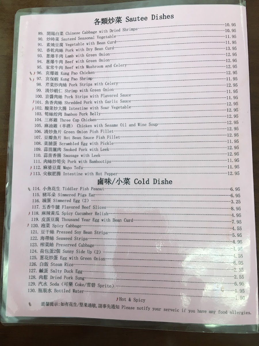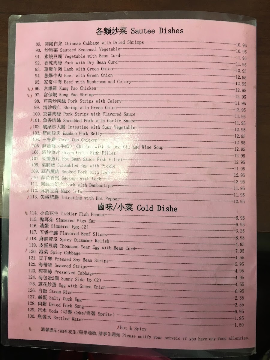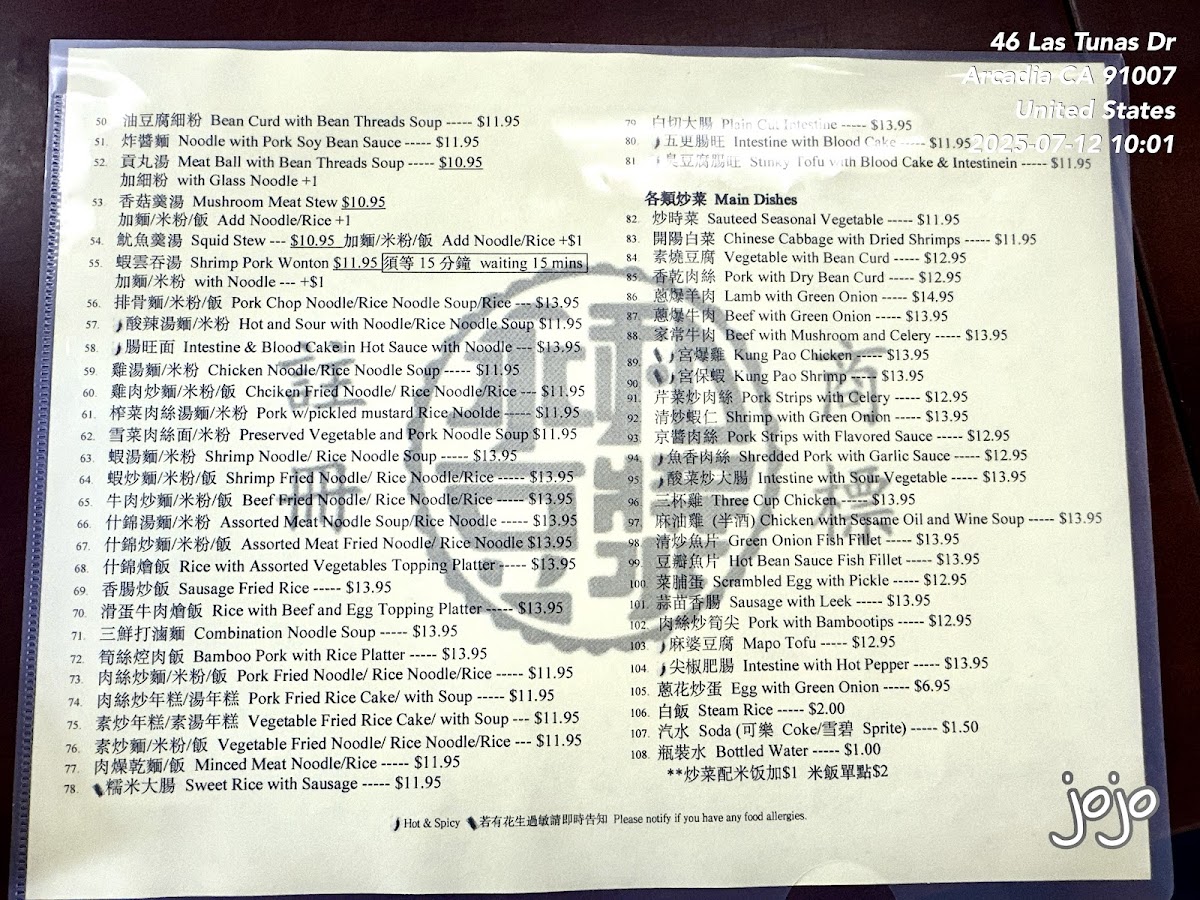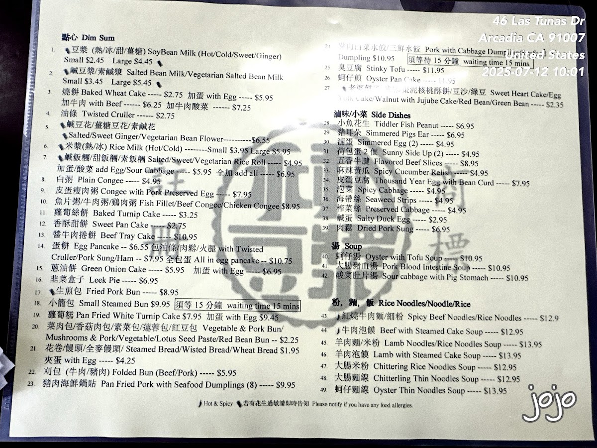 Yung Ho Dou Jiang Restaurant offers a diverse and flavorful menu, perfect for those craving authentic Chinese comfort food. Their dim sum selection includes Salted Rice Roll, Vegetarian Salted Bean Milk, and the classic Pork with Cabbage Dumpling (takes 15 mins), alongside unique options like Stinky Tofu and Leek Pie. For buns, you can enjoy Steam Bun, Vege Meat Bun, and the hearty Whole Wheat Steam Bun. Their soup options are warming and flavorful, with choices like Hot and Sour Soup, Meat Ball Soup, and the more adventurous Pork Blood Intestine Soup. The rice noodles and noodles section offers satisfying dishes like Spicy Beef Noodles and Minced Meat Noodle, as well as Lamb Noodles Soup and Shrimp and Pork Wonton. If you're looking for something lighter, their side dishes like Thousand Year Egg with Bean Curd and Salty Duck Egg are perfect accompaniments. For beverages, they offer refreshing options like Sweet Tea, Sprite, and Chinese Herbal Tea. The main dishes are hearty, with options like Beef with Mushroom and Celery and Pork with Dry Bean Curd, while the Cookies section features treats like Walnut with Red Date and Sweet Heart Cake. Lastly, their congee offerings such as Beef Congee and Congee with Fish Fillet are ideal for a comforting, satisfying meal. Overall, Yung Ho Dou Jiang's menu combines a wide range of traditional and innovative dishes, making it a must-visit spot for anyone looking to explore authentic Chinese flavors.